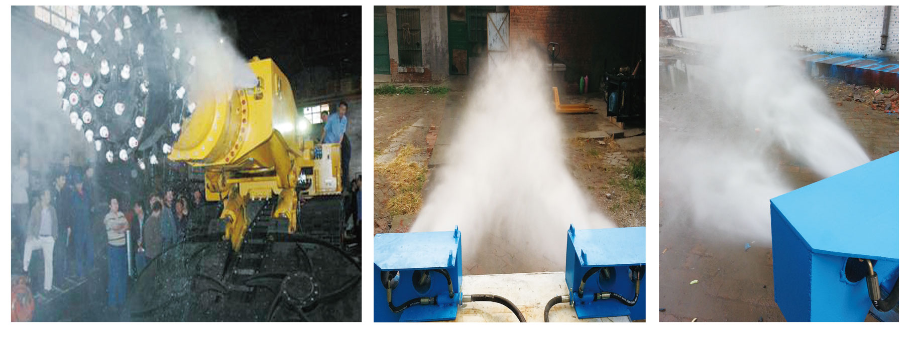 該裝置為機(jī)載式高壓噴霧降塵裝置,可實(shí)現(xiàn)噴霧與掘進(jìn)機(jī)聯(lián)動(dòng),也可由司機(jī)遙控 噴霧,其自動(dòng)增壓系統(tǒng)把水壓提高到10MPa以上,使高壓噴霧降塵器形成高速霧 化圍幕將產(chǎn)塵源完全覆蓋,同時(shí)圍幕周?chē)纬晌鼔m負(fù)壓將周?chē)蹓m吸入圍幕中。 除塵機(jī)理先進(jìn),用少量的水達(dá)到最佳的降塵效果。
