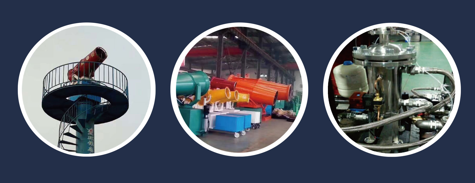 該產品是一套高效遠程噴霧降塵裝置,工作機理先進,是先將水高壓霧化噴出,再利用風送原理將水霧化成50-200微米的水霧顆粒,噴射到較遠的距離,使水霧對物料表面加濕或將水霧和粉塵顆粒凝結從而達到降塵,抑塵的目的。